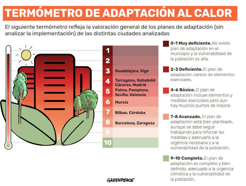 El informe de Greenpeace destaca que no hay ninguna ciudad que tenga planes adecuados al calor extremo (no se ha evaluado la puesta en marcha de estos planes) a pesar de que las olas de calor son cada vez más frecuentes e intensas debido al cambio climático: