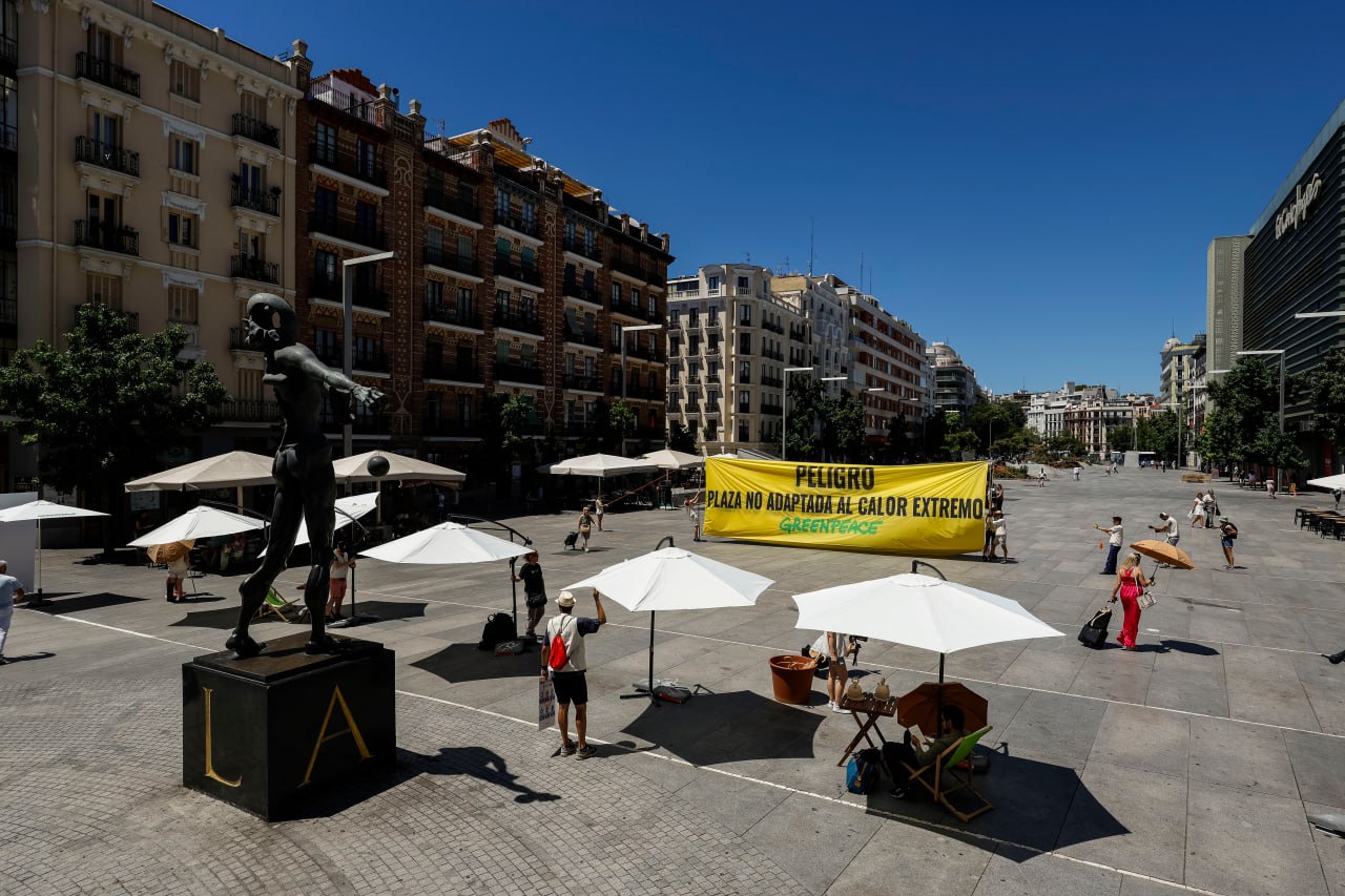 Greenpeace ha desplegado una pancarta de 30 metros con el mensaje “Peligro, plaza no adaptada al calor extremo” en la plaza de Felipe II de Madrid. Alrededor de una decena de activistas han ofrecido también agua, sombra y asientos a las personas que estaban por la zona para ayudarlas a disminuir su riesgo ante las altas temperaturas. Con esta acción, la organización quiere denunciar la falta de adaptación al calor extremo en los entornos urbanos y la urgencia de implementar las medidas necesarias a corto, medio y largo plazo para proteger a la población y transformar los municipios ante el agravamiento de la crisis climática.