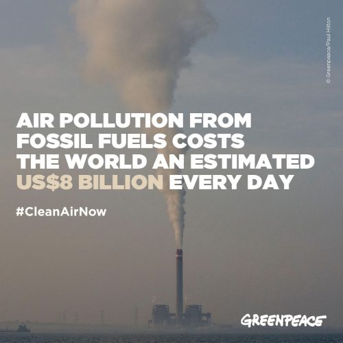 La contaminación del aire por la quema de combustibles fósiles -principalmente carbón, petróleo y gas- está detrás de alrededor de 4,5 millones de muertes anuales en todo el mundo y genera unas pérdidas económicas estimadas en 2,9 billones de dólares, lo que equivale a aproximadamente un 3,3% del PIB mundial. Así lo revela un estudio elaborado por Greenpeace y el Centro de Investigación en Energía y Aire Limpio (CREA), el primero que analiza de esta forma el coste global de la contaminación procedente de los combustibles fósiles, considerando tanto los costes sanitarios adicionales como los días perdidos por baja por enfermedad o muerte prematura en relación a la demografía de cada país.