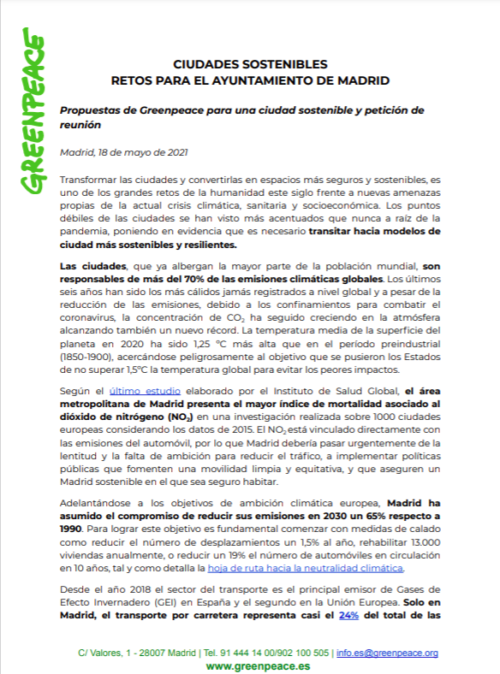 Carta a Jose Luis Martínez Almeida, alcalde de Madrid. Propuestas de Greenpeace para una ciudad sostenible y petición de reunión