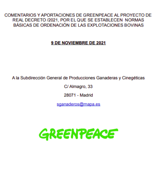 Aportaciones de Greenpeace al proyecto de Real Decreto sobre la ordenación de explotaciones bovinas