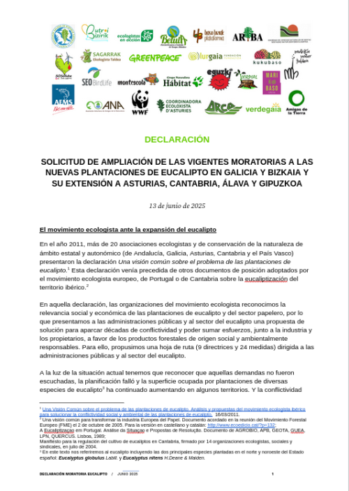 Declaración: SOLICITUD DE AMPLIACIÓN DE LAS VIGENTES MORATORIAS A LAS NUEVAS PLANTACIONES DE EUCALIPTO EN GALICIA Y BIZKAIA Y SU EXTENSIÓN A ASTURIAS, CANTABRIA, ÁLAVA Y GIPUZKOA