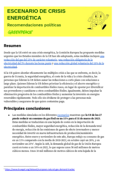 Si la UE quiere abordar eficazmente las múltiples crisis a las que se enfrenta, es decir, la guerra de Ucrania, la seguridad energética, el coste de la vida y la crisis climática, las personas que lideran la UE deben aunar las reducciones a corto plazo con soluciones a largo plazo. Quienes lideran la UE deben priorizar la eficiencia y el ahorro energético y paralizar la importación de combustibles fósiles rusos, en lugar de apostar por diversificar sus proveedores y cambiarse a otros combustibles fósiles. Igualmente, deben impulsar la eliminación progresiva de los combustibles fósiles y aumentar la inversión en energías renovables rápidamente. Todo ello sin olvidarse de proteger a las personas más vulnerables y asegurarse de que quien contamina paga.