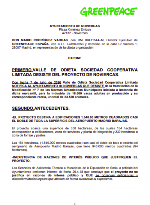 Greenpeace envía hoy un este escrito al Ayuntamiento de Noviercas reiterando su frontal oposición al proyecto de macrogranja. De salir adelante, se convertiría en una auténtica fábrica de cambio climático, ya que produciría cerca de 574.200 toneladas de CO2 equivalente al año, lo mismo que emiten 122.000 coches circulando en un año, o 368.000 toneladas de excrementos al año, lo equivalente a lo que genera una ciudad de unos 4,4 millones de personas