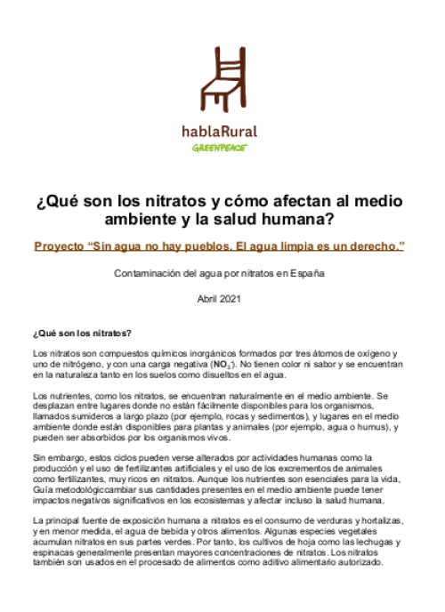 Pero ¿qué son los nitratos y cómo afectan al medioambiente y la salud humana? Greenpeace responde en este documento.