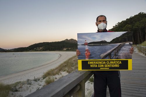 Greenpeace fai desaparecer a praia de Rodas, nas Cíes, para pedir á cidadanía galega que mañá vote pensando no planeta